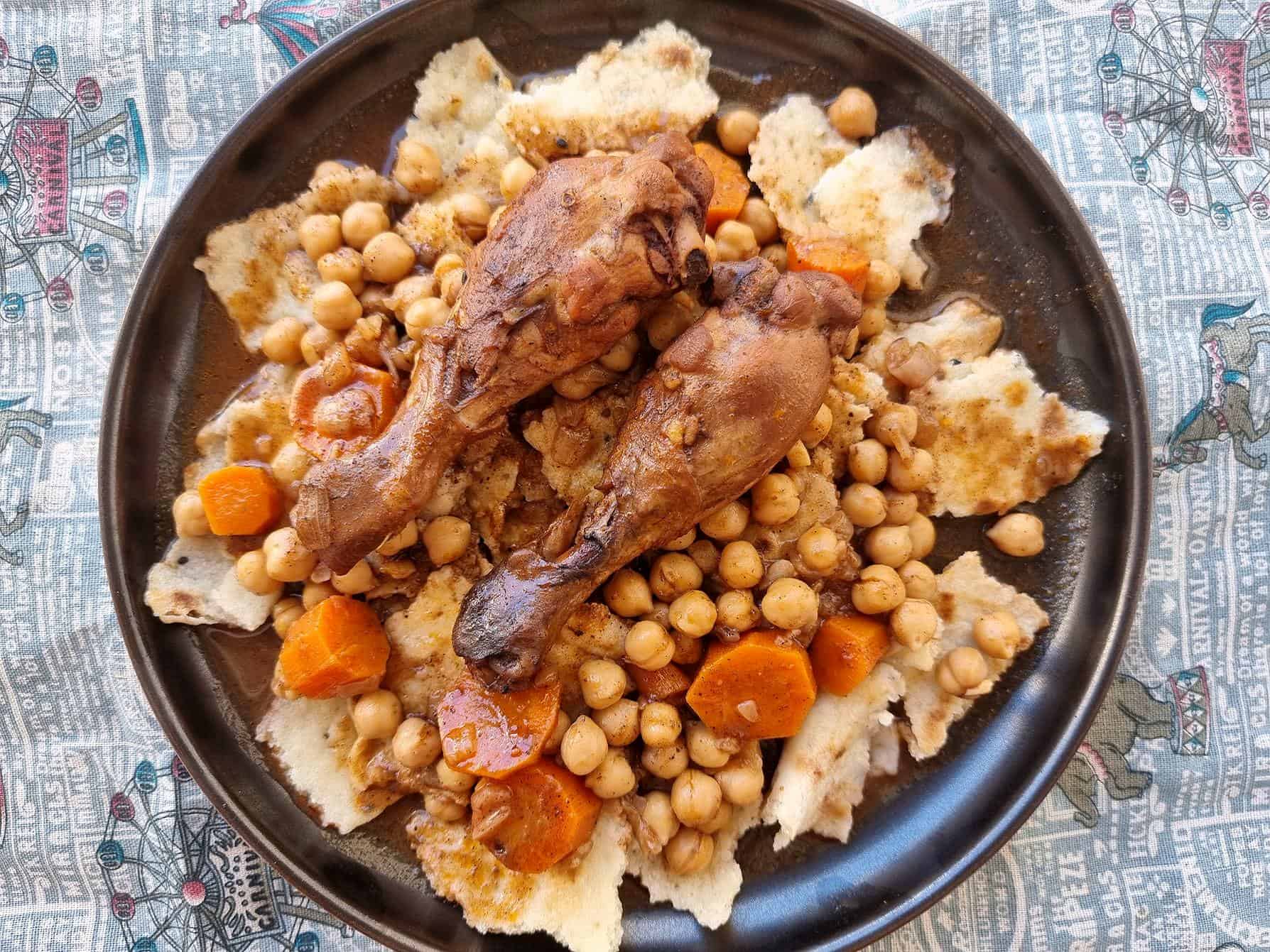 - Arrange steamed torn flatbread on a plate, pour spiced tomato broth to soften it, and top with chicken, carrots, and chickpeas. Enjoy!