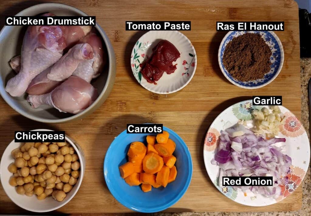 Ras El Hanout: This is a popular North African spice that is a combination of cumin, coriander, cinnamon, ginger, and others. This is the most important ingredient to add flavors to this dish.