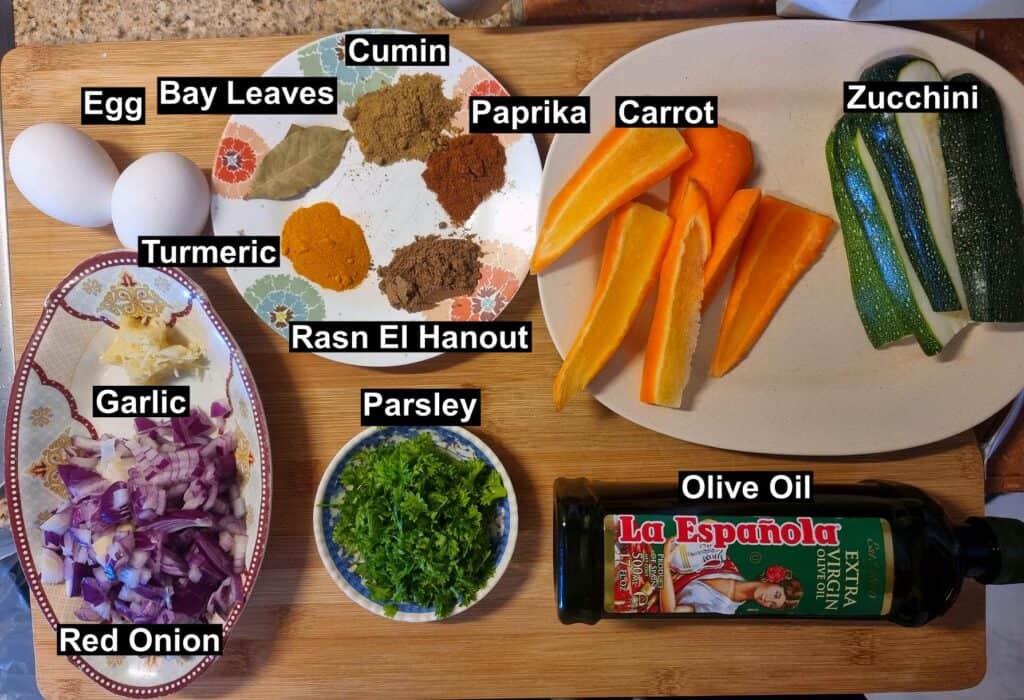 - Spices: The spices I am using include cumin, paprika, turmeric, ras el hanout & bay leaves which provide the dish with a rich Maghrebi flavor and aroma.
