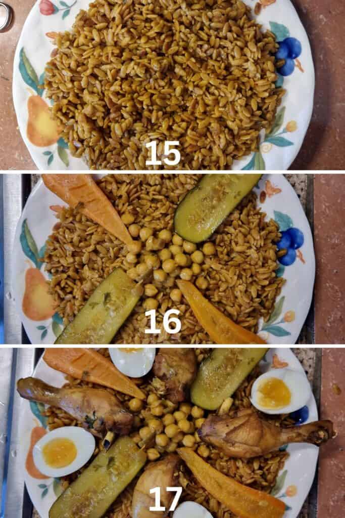 Tlitli is a traditional Algerian dish made with orzo pasta accompanied by chicken, carrots, and zucchini, which is all cooked together in a flavorful broth infused with a blend of vegetables, meats, and spices. This dish involves arranging the base layer of cooked orzo pasta on a large plate that is then topped with the cooked chicken, zucchini, carrots, chickpeas, and boiled egg.