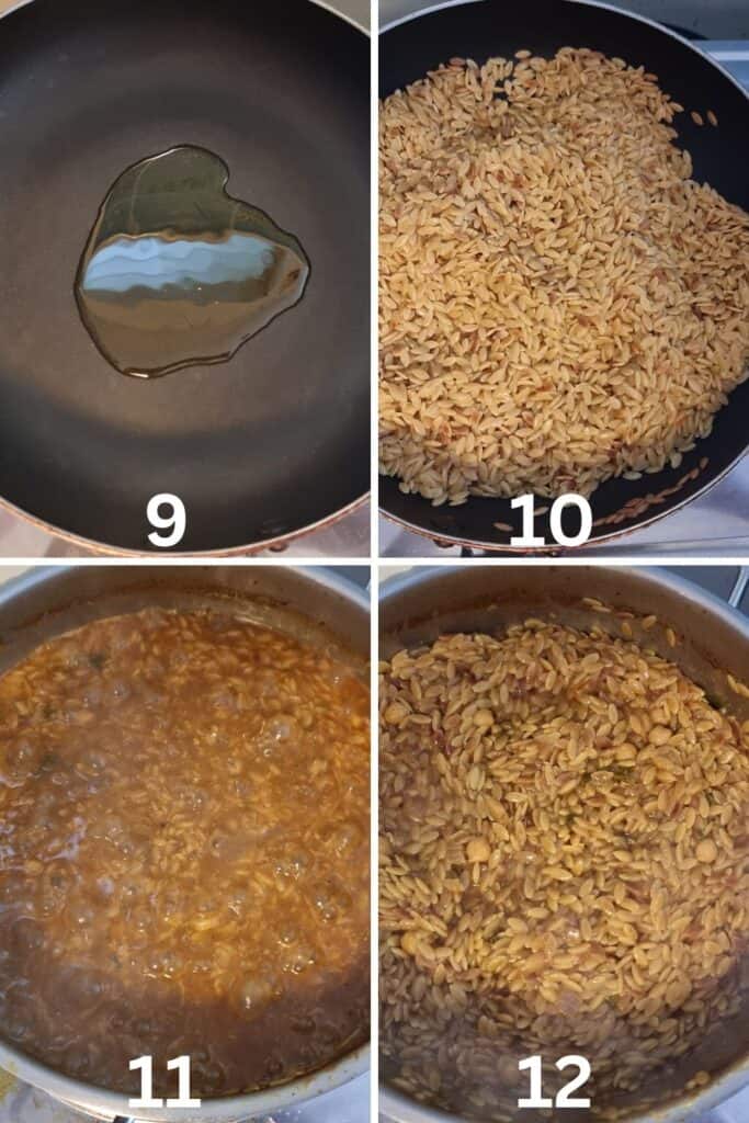 - In a separate pan, heat olive oil for orzo/bird's tongue pasta. Lightly brown the pasta.