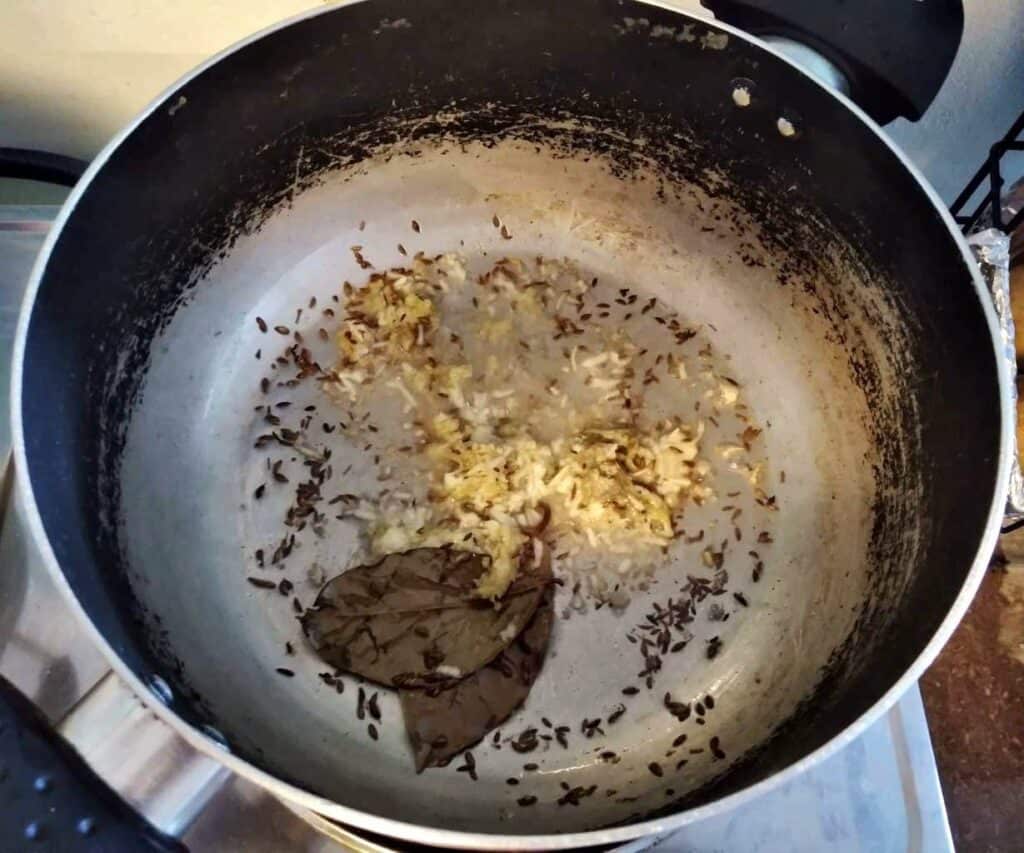 Firstly, I add vegetable oil to the pan, and once it becomes hot I added the cumin seeds. Next, you add the ginger, garlic, and bay leaves and give a stir before you add the onion.