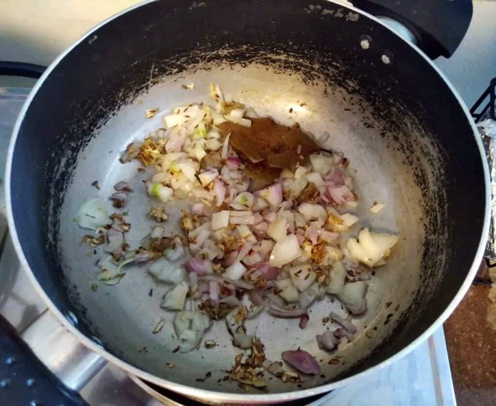 - Add ginger & garlic and bay leaves. Give a quick stir before adding the chopped onion. Stir again until it turns transparent.