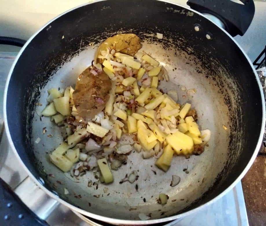 - Add chopped potatoes. Let it saute for 5 minutes or until it is half cooked