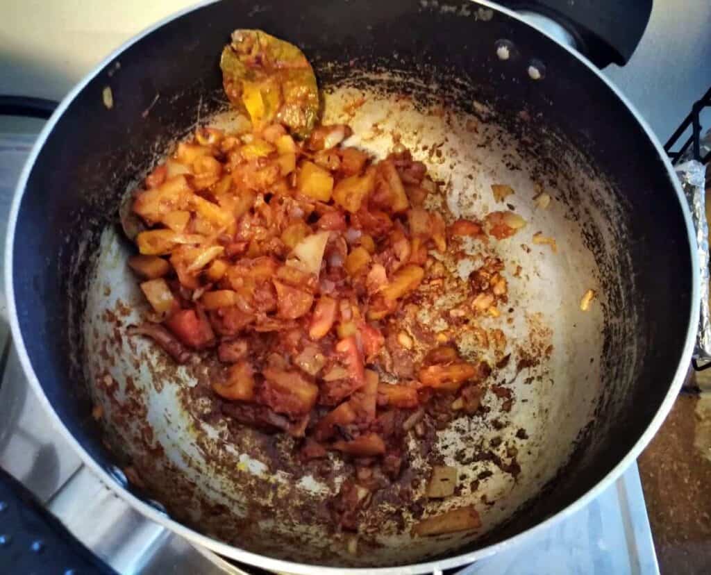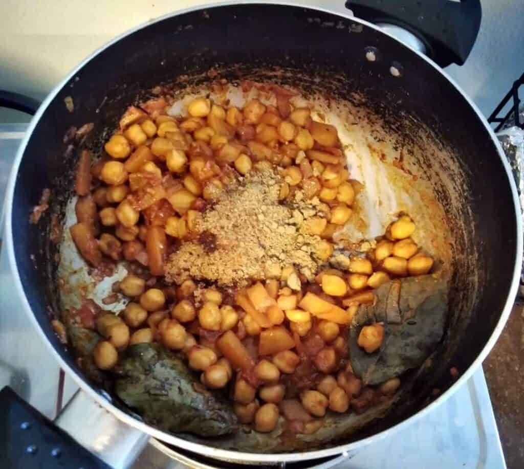 And then I add the potatoes and once it is cooked then I add the chopped tomatoes. After that, I added the spices, except the Garam Masala, which I stir for few minutes before I add the chickpeas.