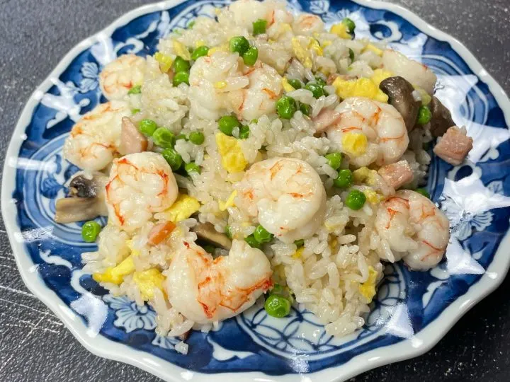 This Chinese Shrimp Fried Rice Recipe is the way we made it at home growing up! This shrimp stir-fried rice is combined with frozen mixed vegetables such as corn, peas, carrots, diced ham, and chopped mushrooms.