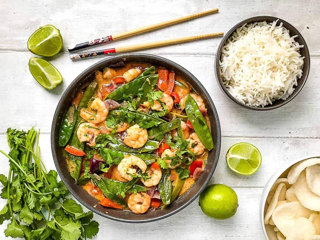 A Thai Red Prawn Curry is quick, easy, full of flavour, and ready in just 15 minutes. Prawns and vegetables are cooked in a spicy coconut milk curry sauce and served with rice or noodles