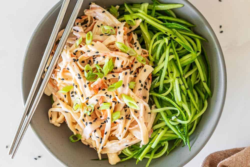 This Spicy Crab Kani Salad is a thinly shredded imitation crab tossed in a homemade Asian-inspired Sweet and Spicy Mayo Sauce. This salad can serve as a side dish for salmon, katsu or any meat dishes.