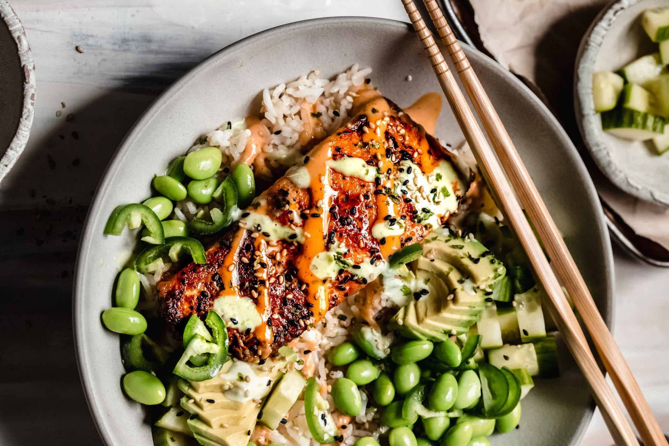 These Spicy Salmon Sushi Bowls feature broiled salmon, wasabi sauce, and all of the fresh toppings you want. Served over rice, these deconstructed sushi bowls are perfect for both lunch and dinner and can be made in under 30-minutes!