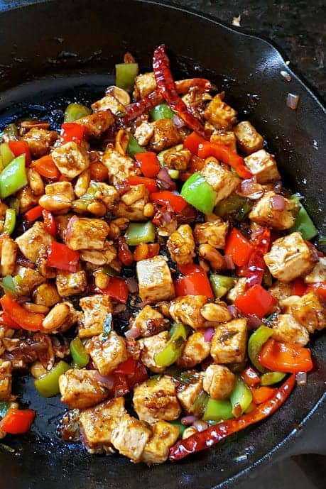 Kung Pao Tofu is a Chinese stir fried crispy Tofu recipe that is mixed with peanuts, bell pepper and other vegetables, chilies, and a sweet spicy and savory sauce. What makes it spicy is that it contain an important Chinese dried chili ingredients called Szechuan peppers also known as Sichuan peppercorns.