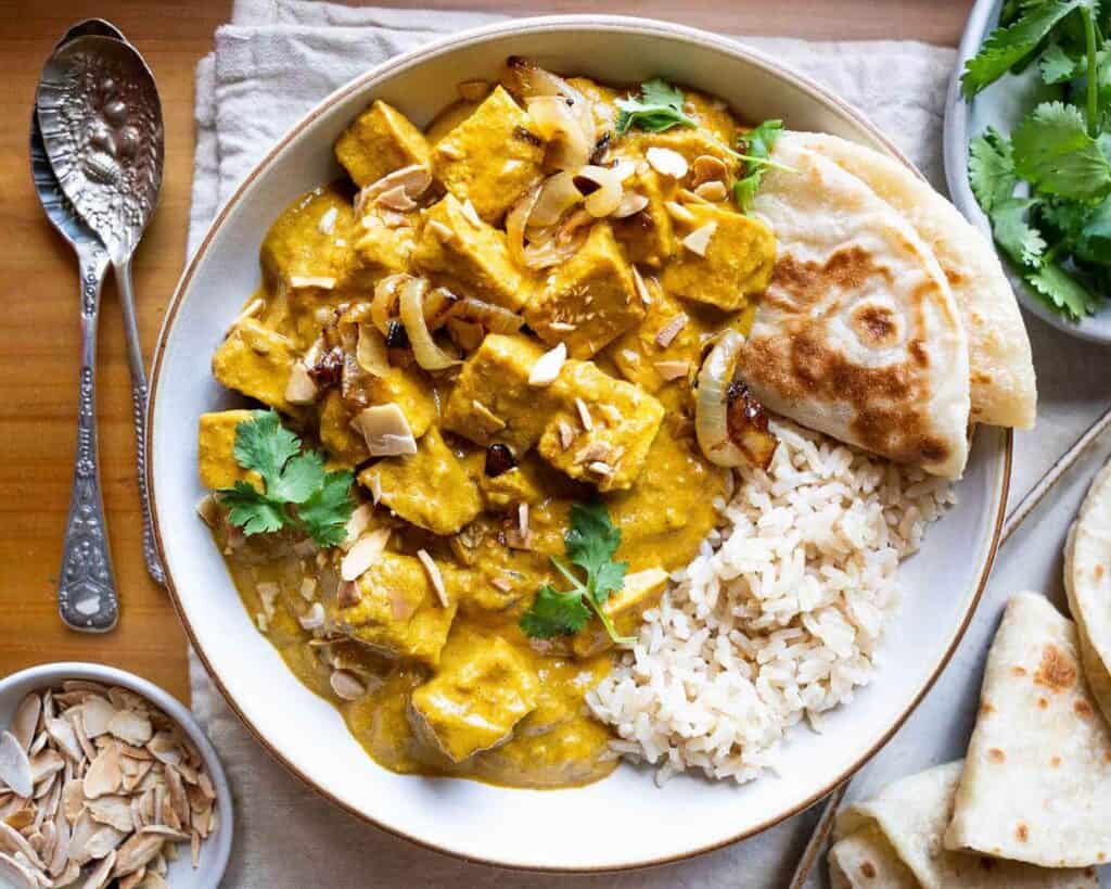 This is an Indian Tofu Tikka Masala that is spicy and creamy that is best eaten with rice or roti bread. What makes it red is the tomato paste, the creaminess from yogurt and coconut milk, and the aroma and flavor from the Indian spices.