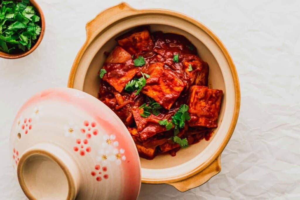 This is a Korean pan-fried tofu dish that is simmered in a spicy, sweet, and salty sauce, and it is best paired with white steamed rice. The spiciness comes from gochujang paste which is an important condiment in Korean cooking.