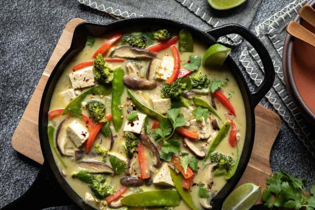 This is a Thai green curry that is made with green curry paste, coconut milk, and other ingredients that can be made in 30 minutes! Although it contains tofu, it is not vegan-friendly since it contains coconut milk and fish sauce. Nonetheless, it is delicious, creamy, and flavorful, which is best paired with rice.