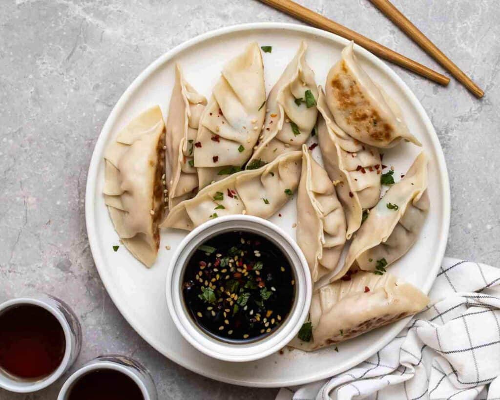 The Chinese dumplings are filled with tofu and other vegetable fillings like cabbage, carrot, mushroom, and green onion with condiment sauce like sesame oil, soy sauce, and vinegar. It is traditionally served as an appetizer or side dish, which you can eat alone or served with rice/noodles.