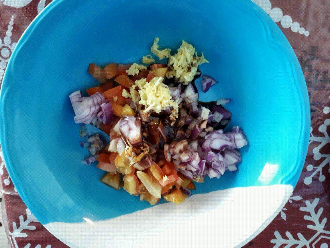 Firstly, add the chopped onions & tomatoes, grated ginger, and soy sauce into the large bowl. Gently stir to mix.