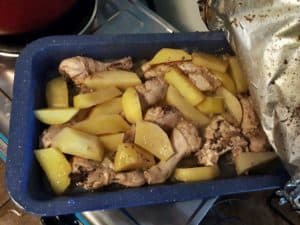 - After 15 minutes, put the chopped potatoes into the tray. Continue cooking for remaining 15 to 20 minutes.
