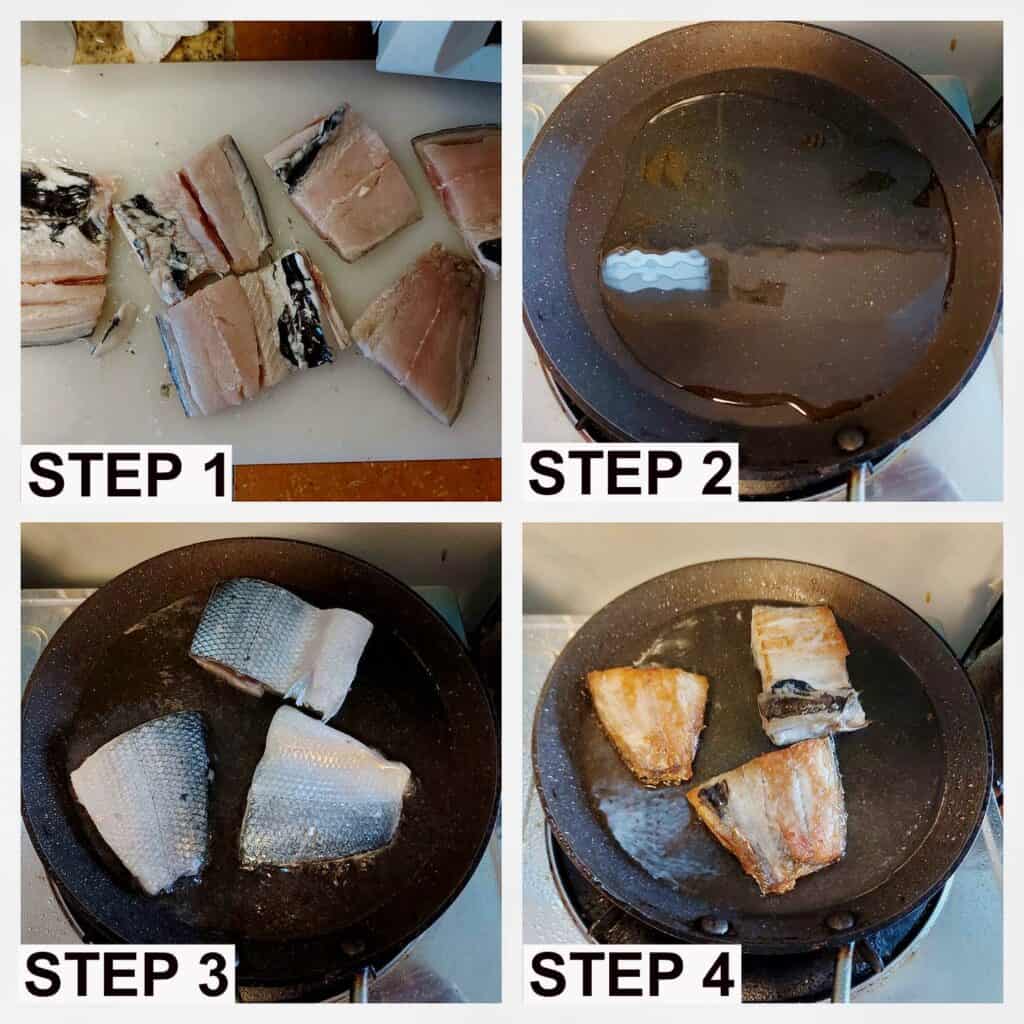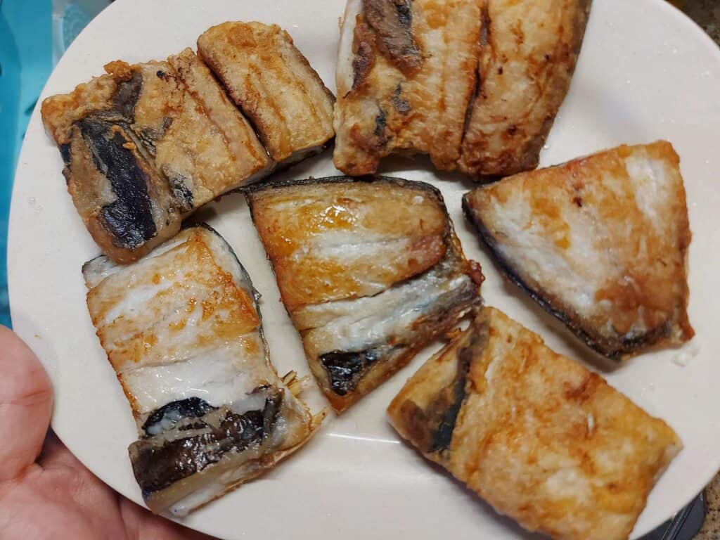 - Once the oil is hot, I added each piece of the milkfish to the pan.