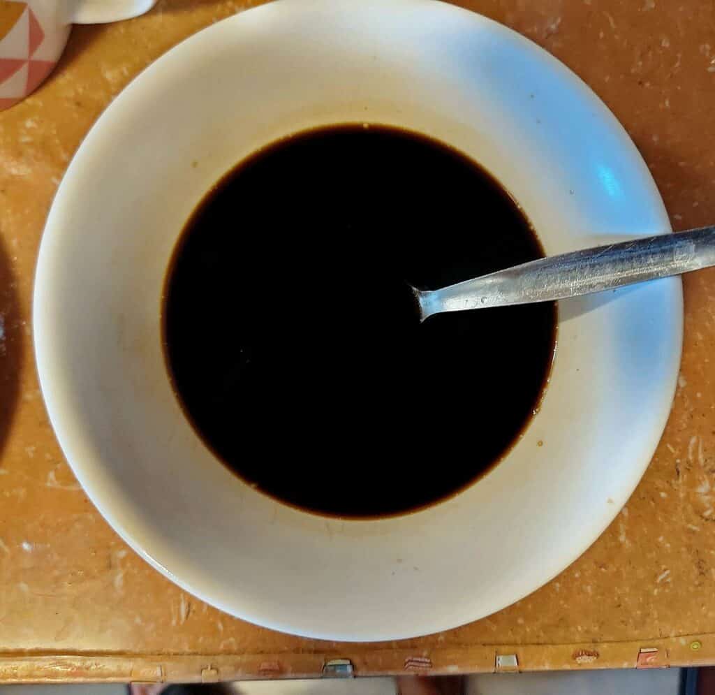 - I combine soy sauce, vinegar, oyster sauce, and brown sugar in a small plate bowl which I set it aside.