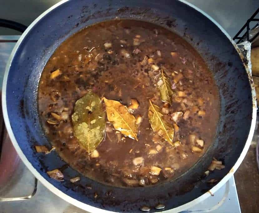 • Add the marinated sauce, including garlic and bay leaves, and water. Stir to mix before adding the beef.