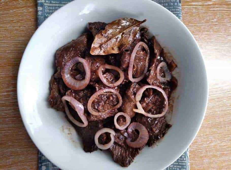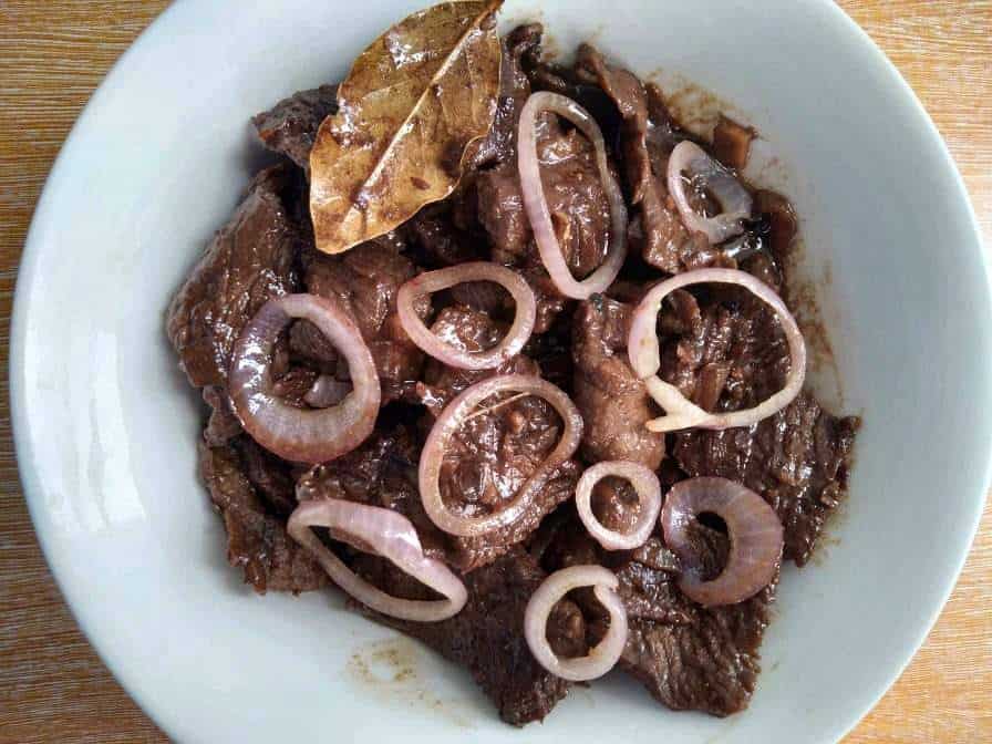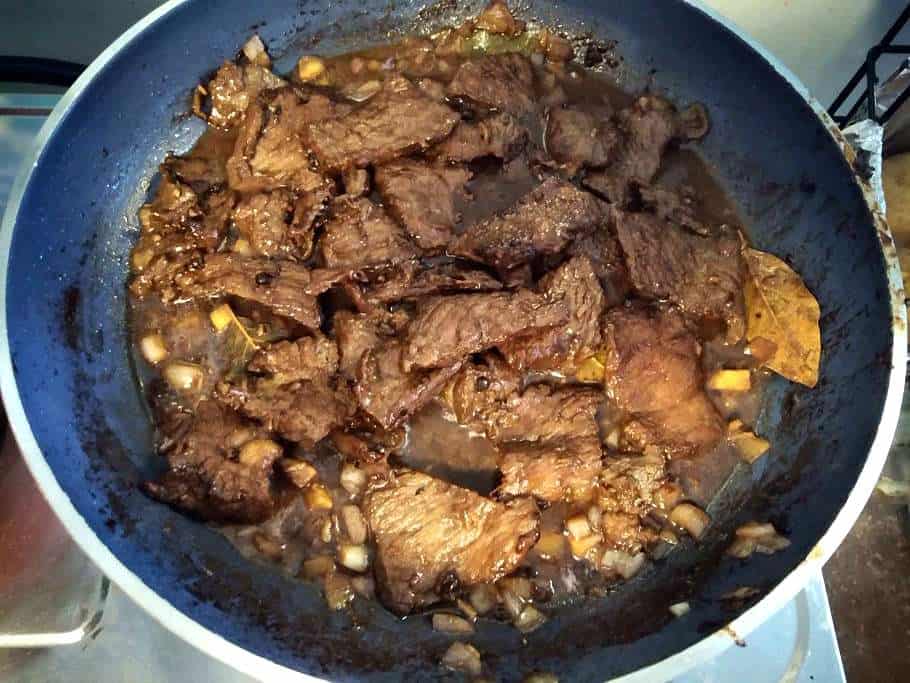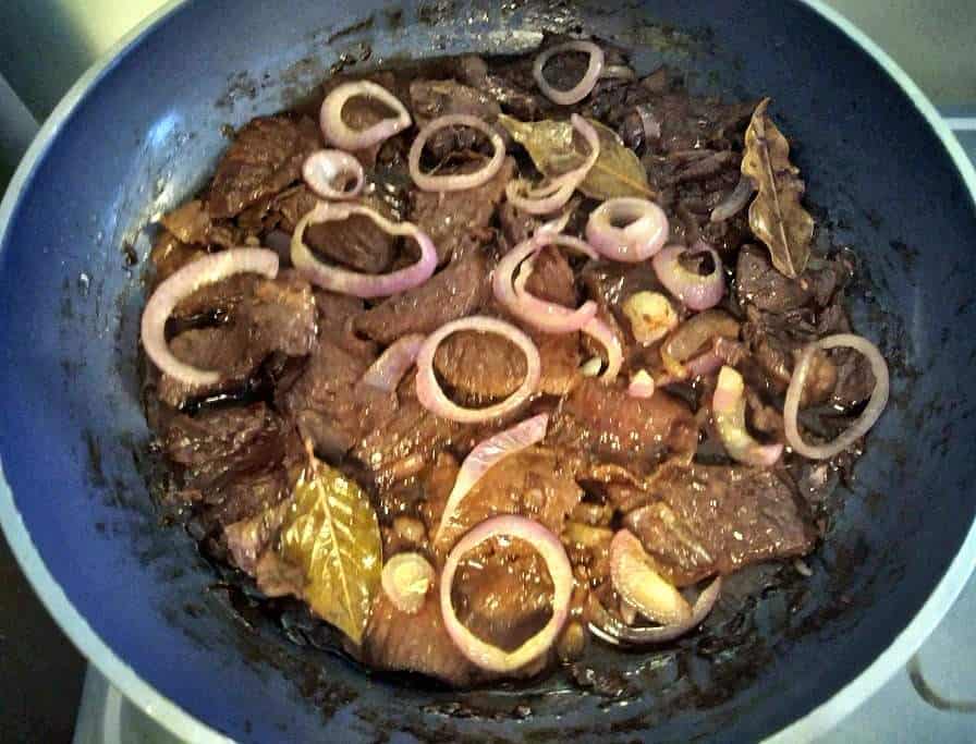 In the same pan, add the chopped onion and give a stir until the onion is cook. Pour the marinated sauce and water, including the bay leaves and the garlic. Add the beef, and stir lightly. Lower the heat, and let it simmer for 35 to 45 minutes or until the beef steak becomes soft and tender. Add more water if needed.
