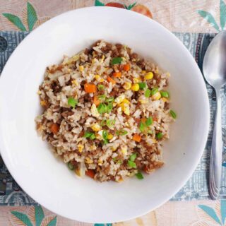 Chao Fan is my Chowking inspired stir-fry Fried rice that is mixed with ground meat, chopped cabbages, carrots, and left-over rice. It is seasoned with oyster & soy sauce and garlic to add the savory flavor of the rice