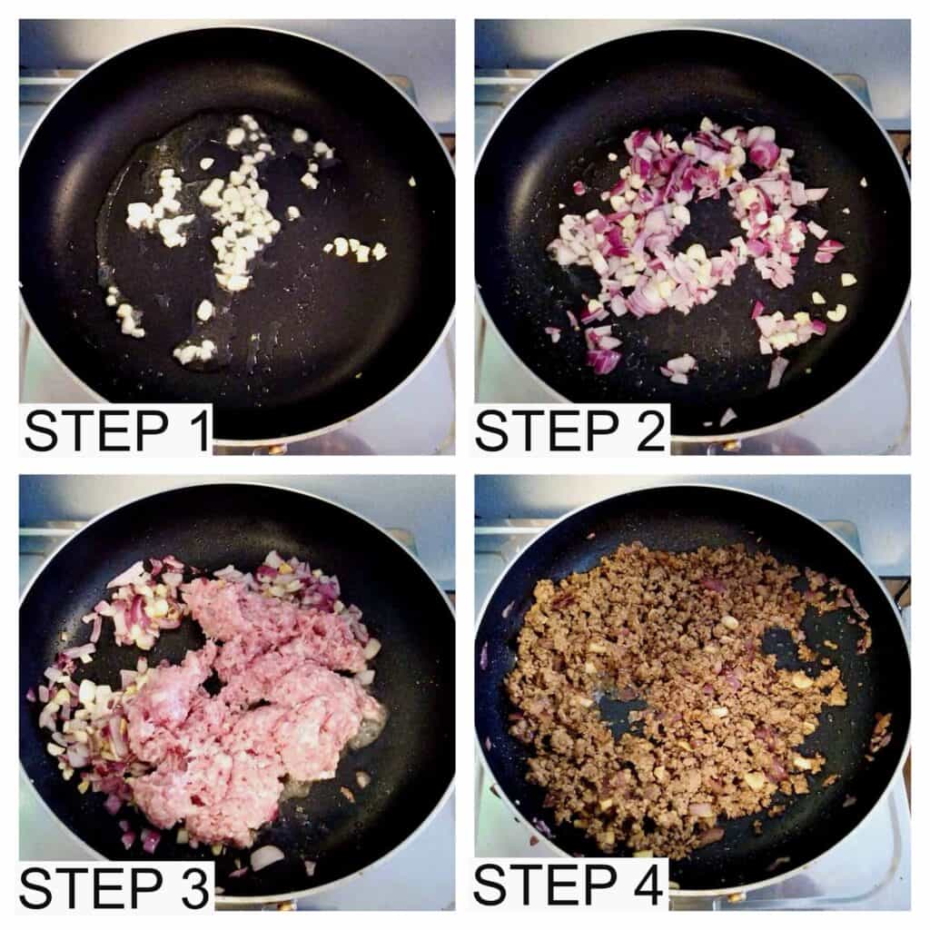 - Add the ground beef. Stir again and let it cook till the juices are almost evaporated.