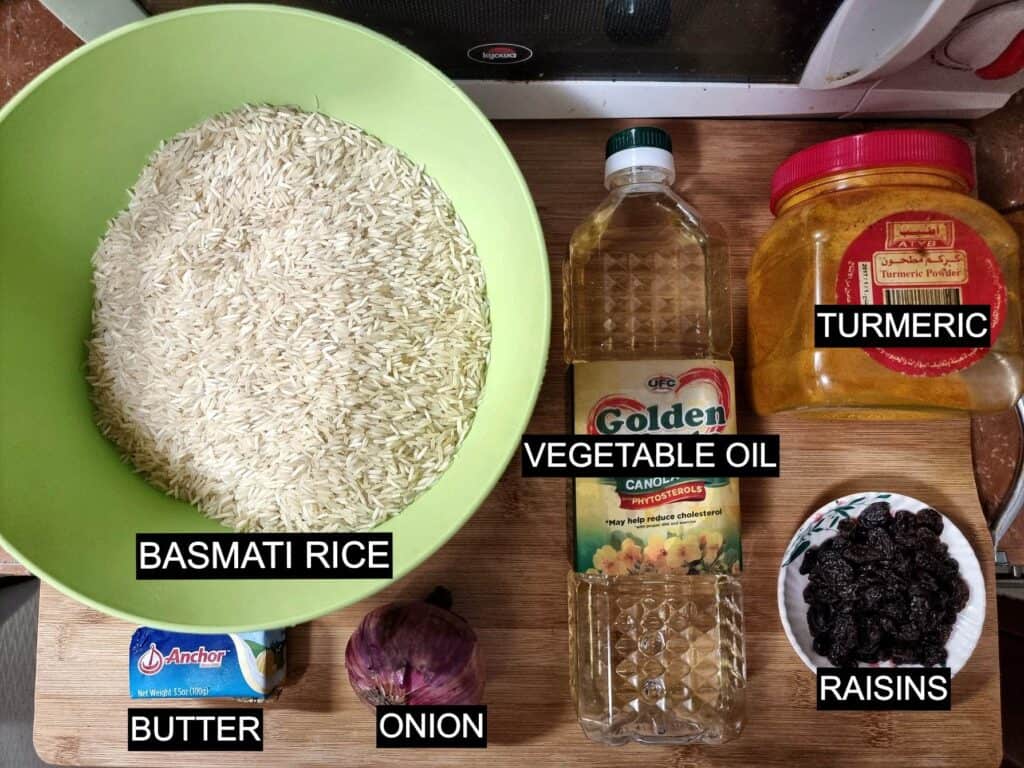 Turmeric: The turmeric is used to give the rice a yellow color.