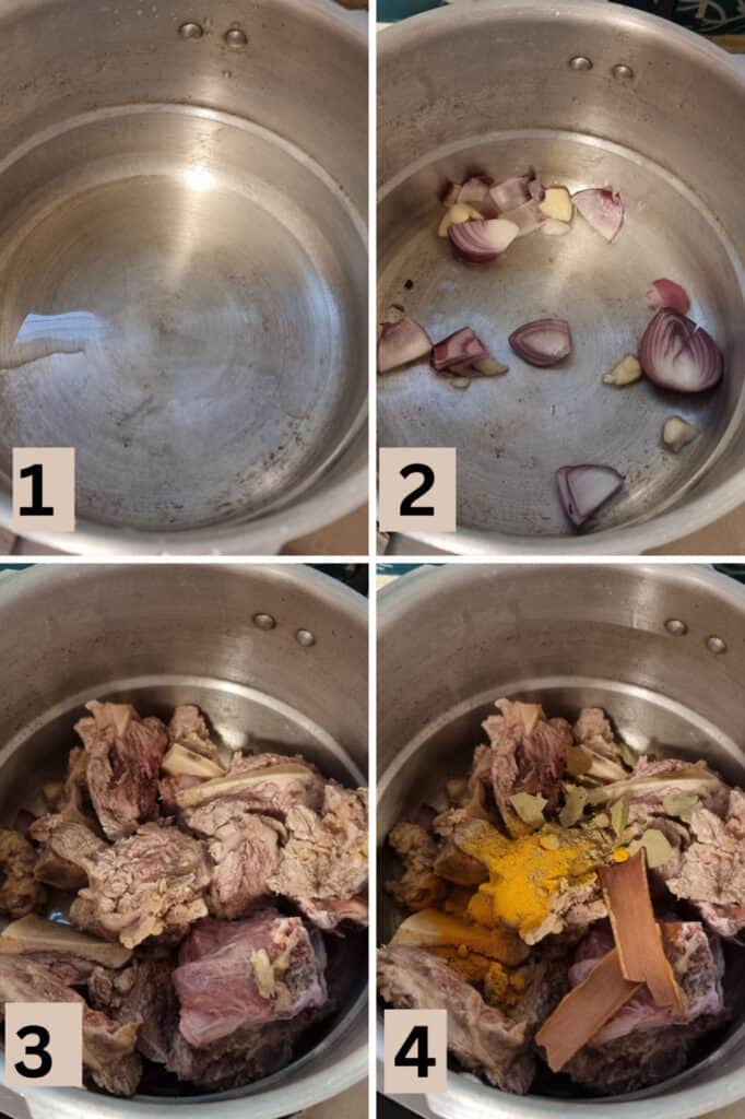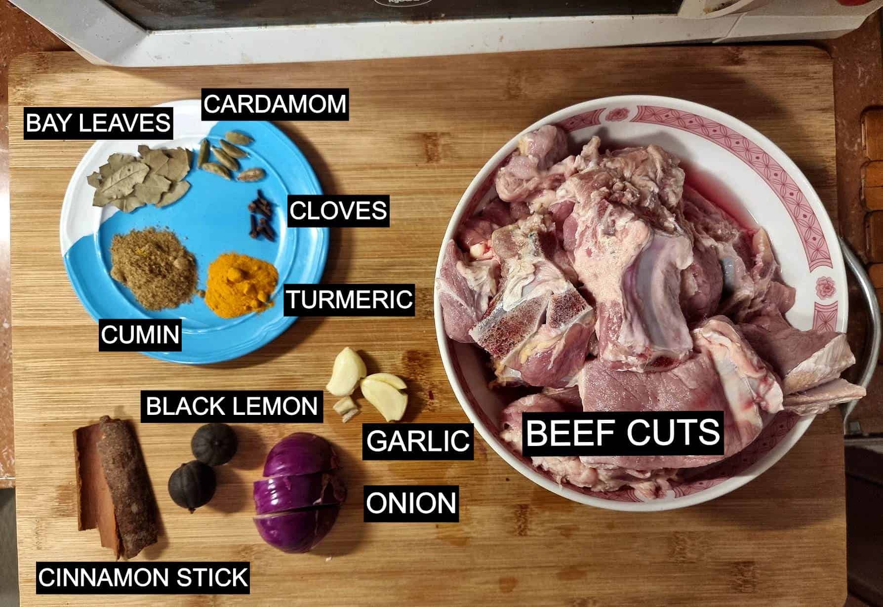 The beef is boiled with the spices along with onion, garlic and black lime, which is then cooked till the meat is tender. The stock from the beef will then be used to cook the basmati rice, giving a fragrant flavor.