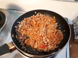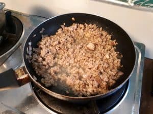 - Add the ground beef, and stir it well for few minutes. The ground beef will be releasing its juices, and it make sure it is fully evaporated before adding seasoning.