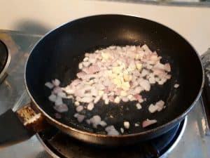 - Add a cooking oil in the frying pan. Once it is hot, add the onion and stir it for few minutes until the color change lighter. After that add garlic, and stir it for up to 1 minute.