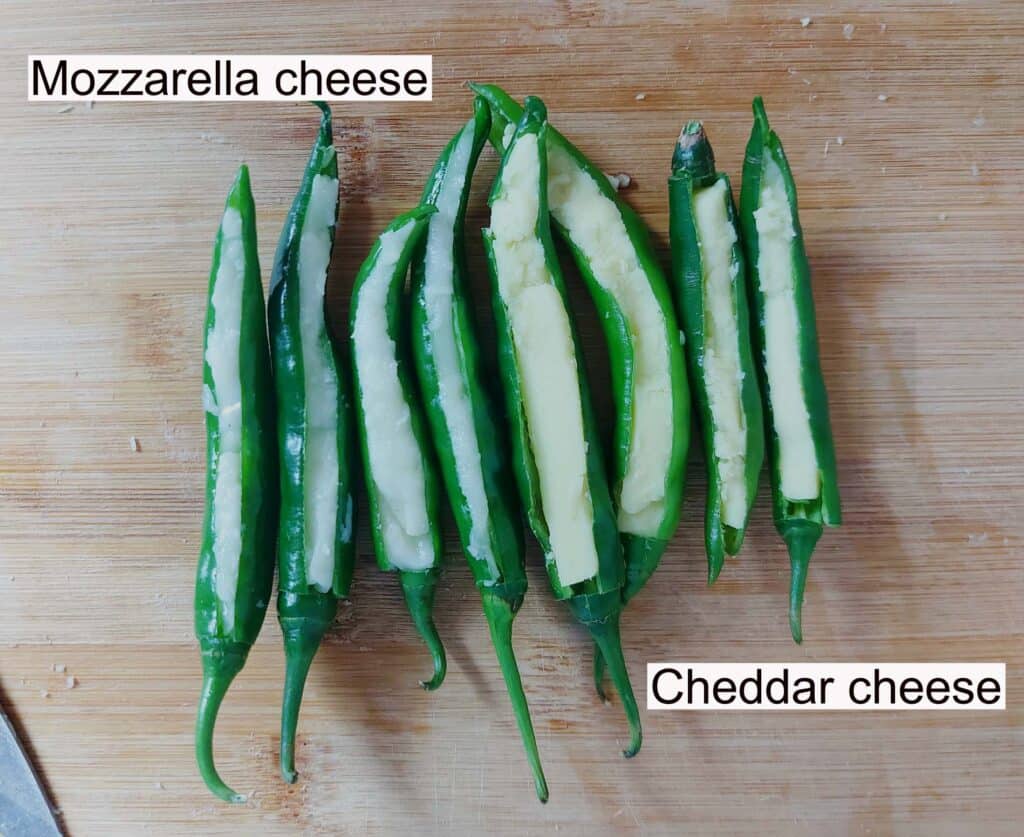 - After that, I stuffed it with either mozzarella or cheddar cheese.