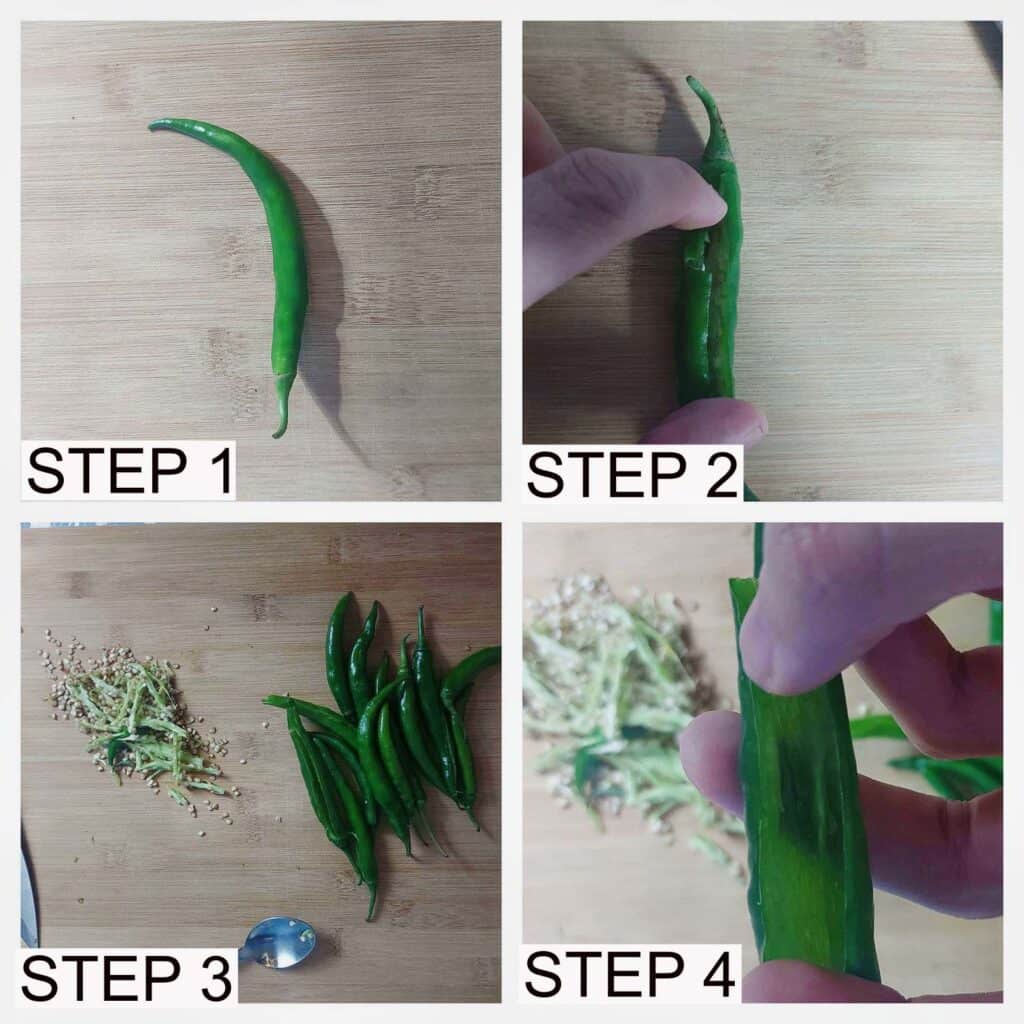 - Next, use a small spoon to scrape the seeds from the chilies.