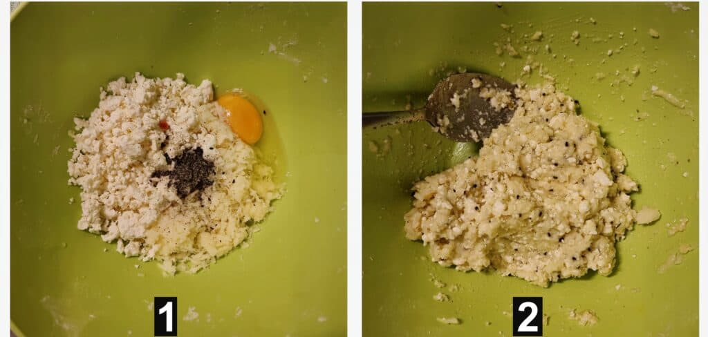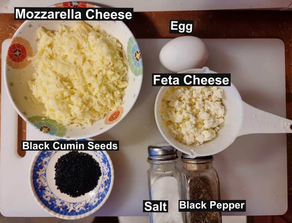 - Combine mozzarella cheese, feta cheese, egg, black cumin seeds, salt, and black pepper in a large bowl, stirring gently before setting it aside.