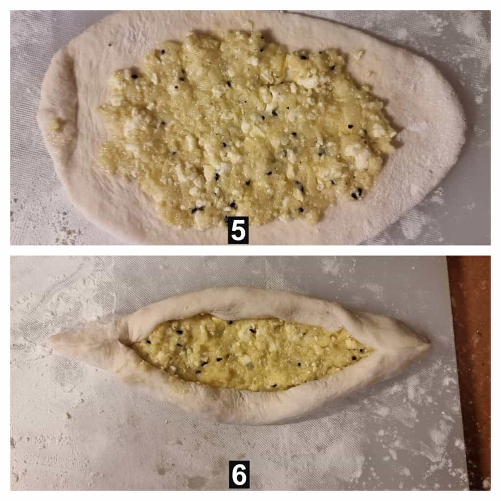 Next, for the topping, fill 1.5-2 tablespoons of the cheese mixture onto the dough and spread it evenly. Then, I fold the dough over the filling on all sides and pinch the ends together to form a boat-shaped pastry