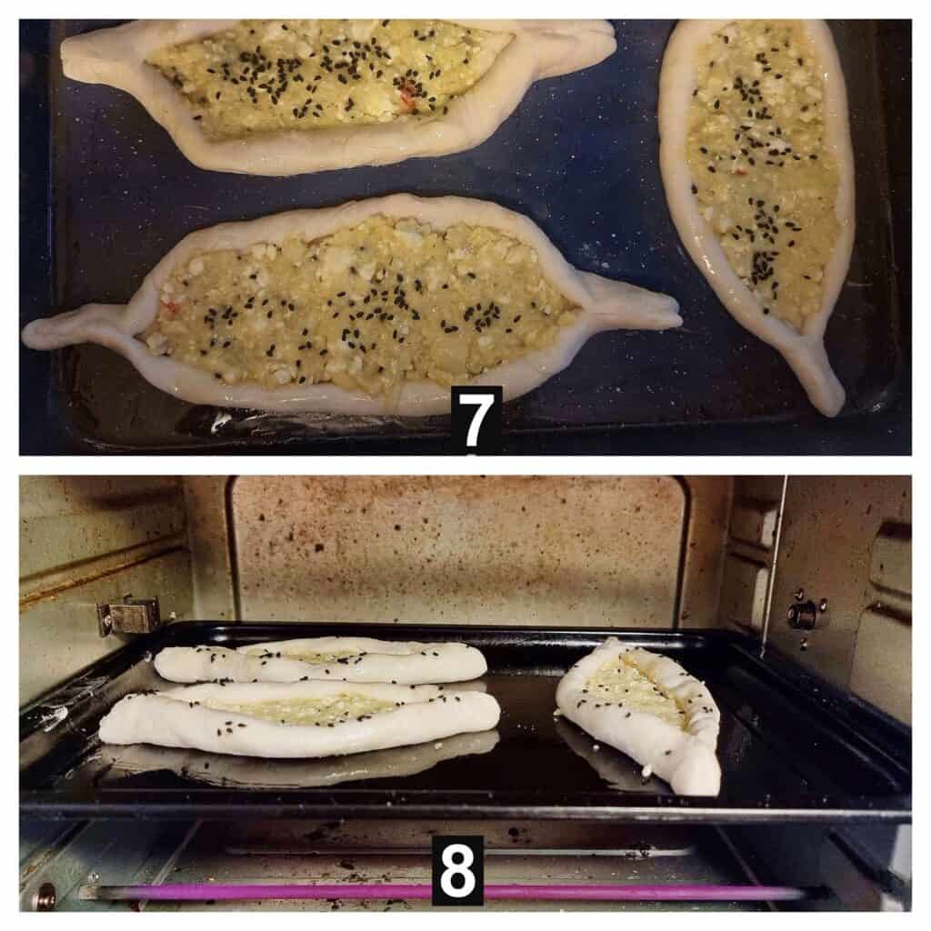 - Next, for the topping, fill 1.5-2 tablespoons of the cheese mixture onto the dough and spread it evenly. Then, fold the dough over the filling on all sides and pinch the ends together to form a boat-shaped pastry.