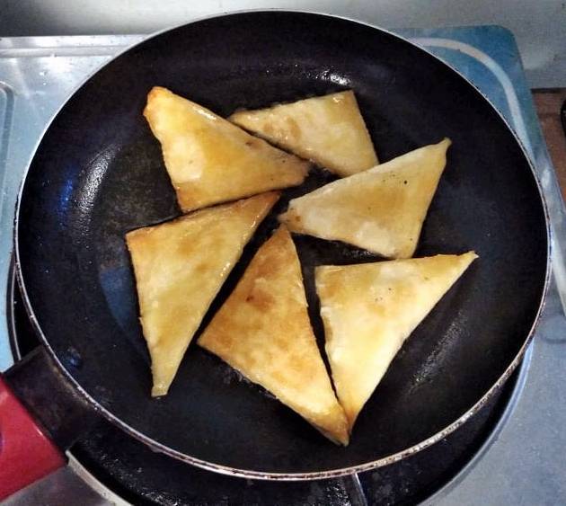 Once you are done with the wrapper, just pour vegetable oil into the pan. Once it becomes hot, add the samosas. I fry it for at least 1 minute on each side or till it turns light brown.