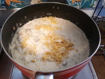 - After the chicken is cooked well, add the cream and cheddar cheese in the pot. Mix it well for few minute. Do not add the parmesan cheese yet.