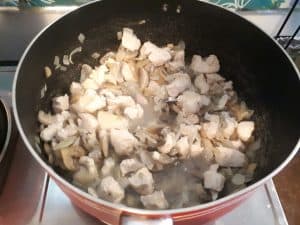 - Once the mushroom turned into a little brown, add the chicken and stir for few minutes. Add ½ cup of water on the pot, and let it cook for 3 to 4 minutes.