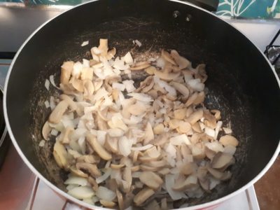 - Once the onion is almost cooked, add the mushroom and stir it. Let it cooked for 2 to 4 minutes in medium heat.