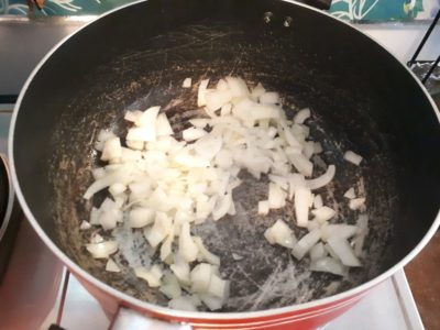 - Add the vegetable oil in the pot. Once it is hot, add the onion and stir it for 1 to 2 minutes.