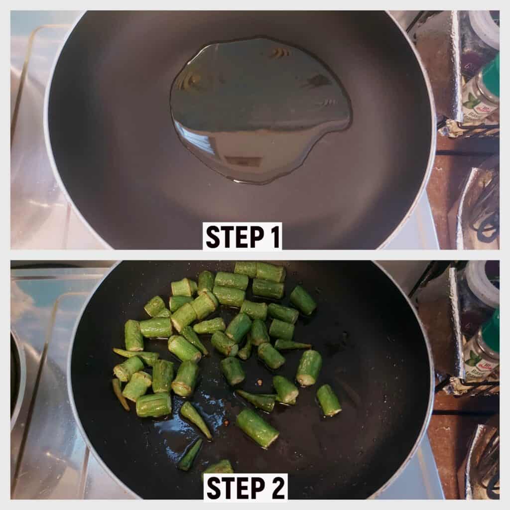 - Pour 5 tablespoons of vegetable oil in the pan. Once hot, add the okra. Stir till there is no more sliminess. Set it aside.