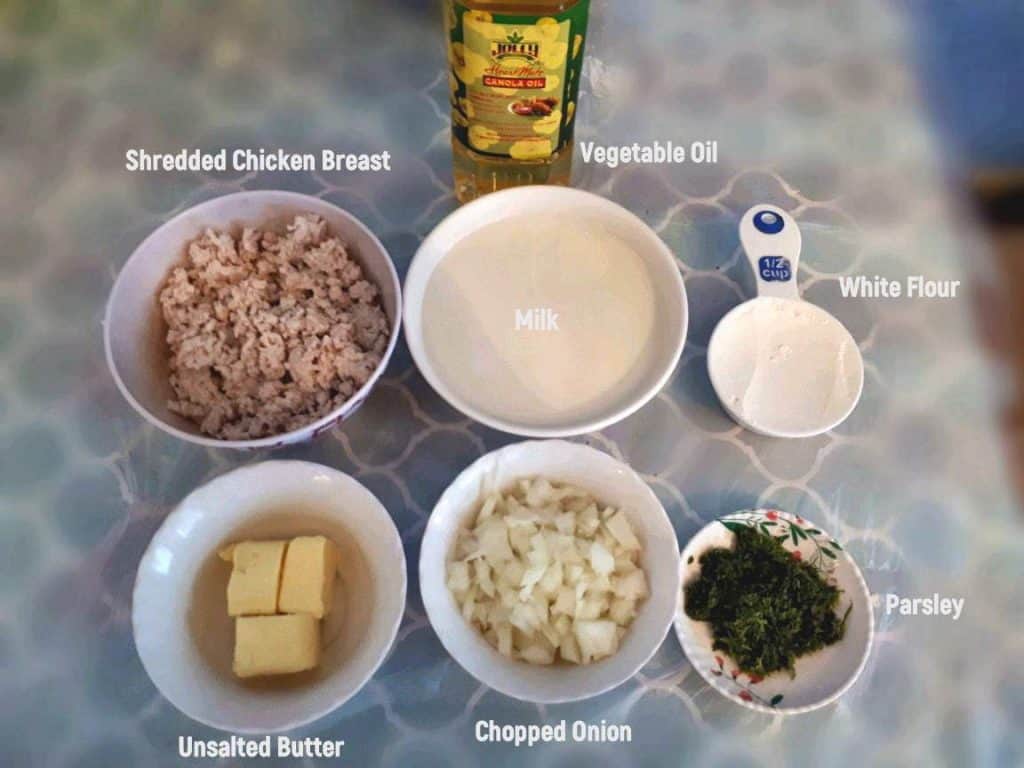 For a chicken croquette recipe, there are several ingredients you need which are very important for this dish. I use shredded chicken breast, which I boiled them first, and then once it is cooked, I shredded them into small pieces. To make the croquette creamy, I use oil, butter, and milk. They are needed to moisten the meat. Furthermore, to have a nice taste, you need chopped onion, parsley, and salt & black pepper. Lastly, you need white flour to make the chicken can stick together. This is important because you don't want the chicken to be watery or soft before frying them.