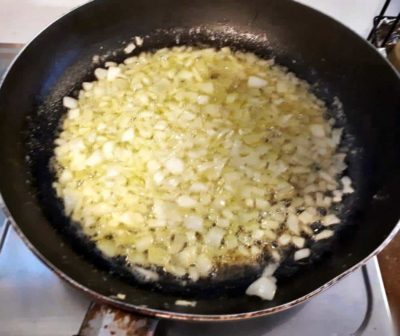 - Once the butter is melted, add onion. Stir it for few minutes or till light brown.