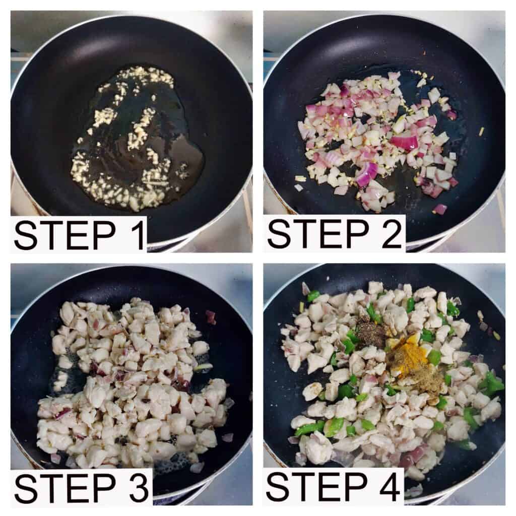 To make the chicken fatayer fillings, I add olive oil to the pan. Once hot, add the garlic and onion and stir till it turns translucent. After that, I add the chicken breasts and let them cook till there are fewer juices followed by adding the bell peppers.