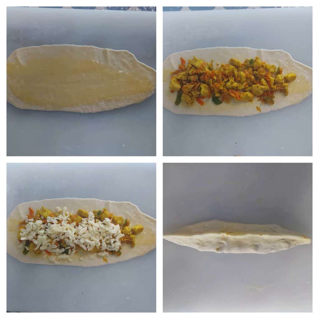 In each dough, I use the rolling pin to make it into an oval-shaped dough, and I stuff it with chicken fillings (estimate how much you want) and mozzarella cheese. After that, I pinch them together in the center to close the edge of the dough.