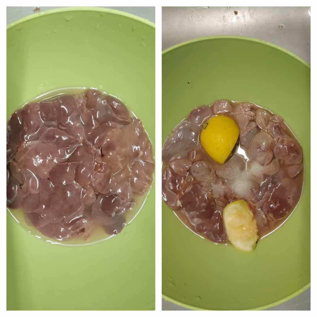 - Add a few slices of lemon and 1 tablespoon of salt to the washed liver. Use your hand to mix it. Leave it for 5 minutes