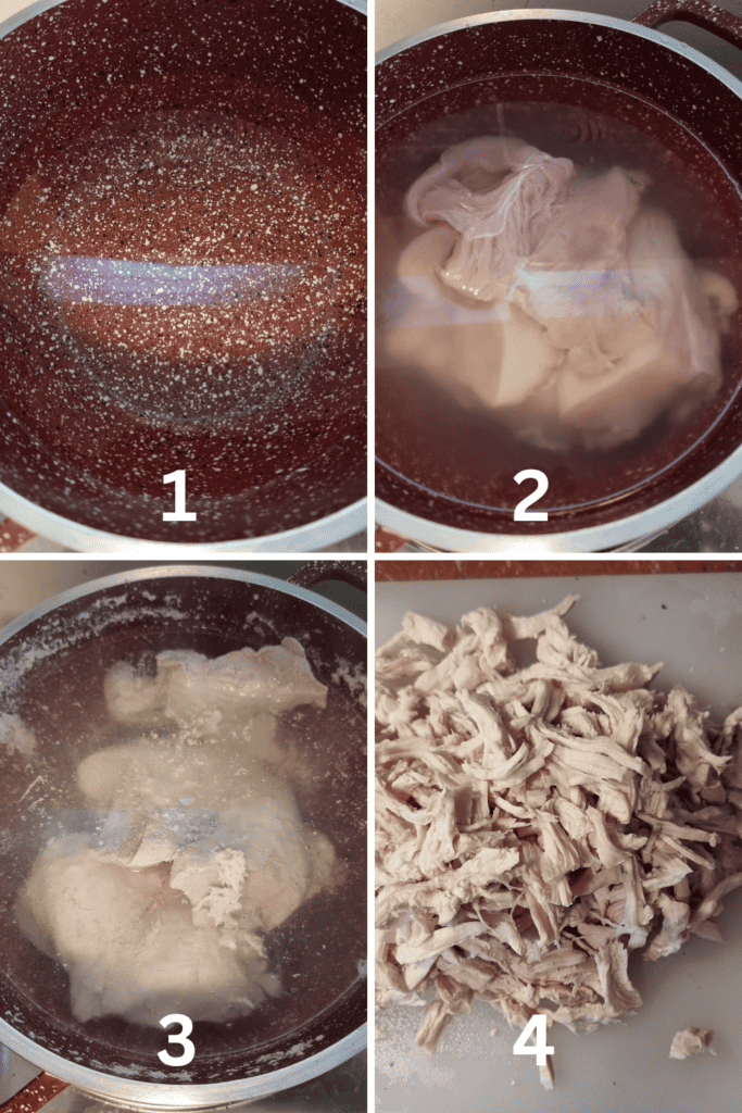- After boiling, remove the chicken and let it cool before shredding it into pieces. Set aside.