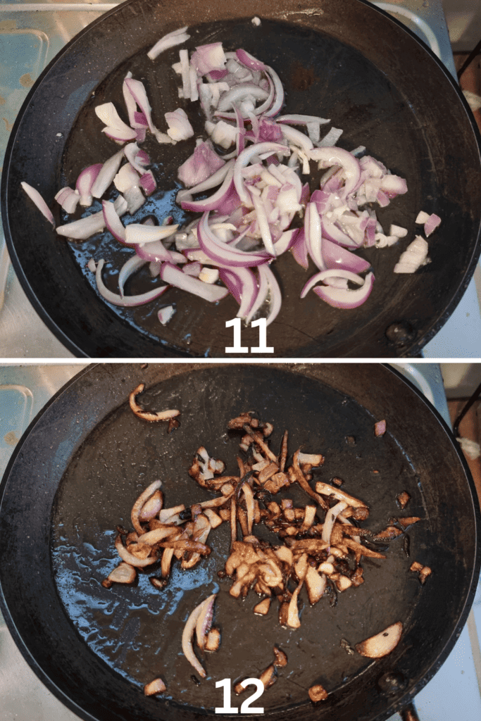 Steps 11 & 12: While you are cooking the rice, I sauteed the thinly sliced onion by cooking it in oil over medium heat in a separate pan. Stir frequently, until they achieve a caramelized, golden-brown color. Set it aside when done.