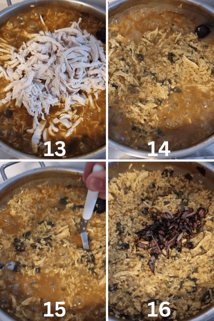 Steps 13 & 14: After overcooking the rice, I added the shredded chicken breast to it. Gently stir to combine