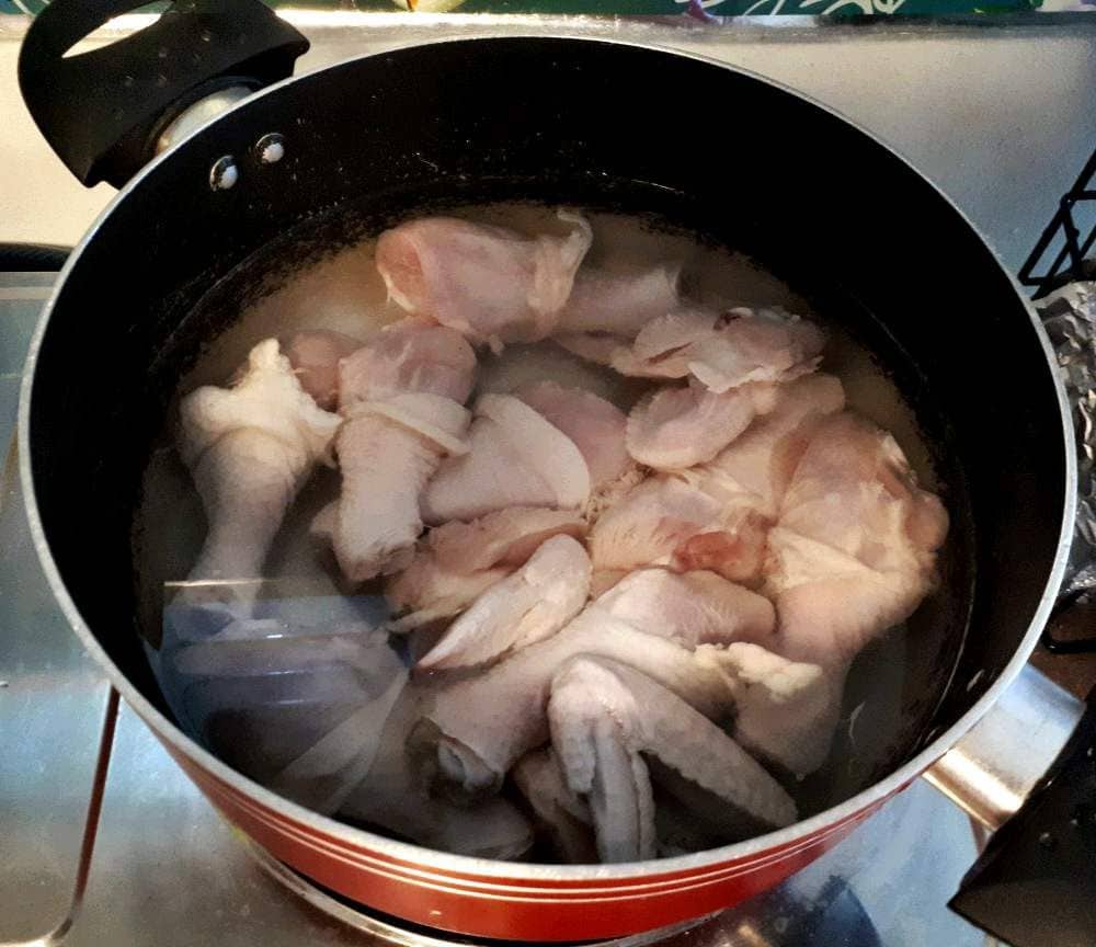 - Turn on the heat. Put the chicken in the cooking pot and add water. Let the chicken boil.